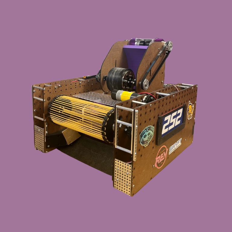 This is our second robot, Bob. We used Bob for RI qualifiers and States. This robot features a rubber band-based intake, a spindexer for storage as well as sorting, and a flywheel for the shooter. It can shoot from both zones and has a 9 artifact auto, and moves to get a ranking point