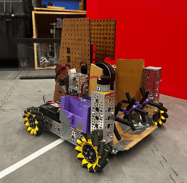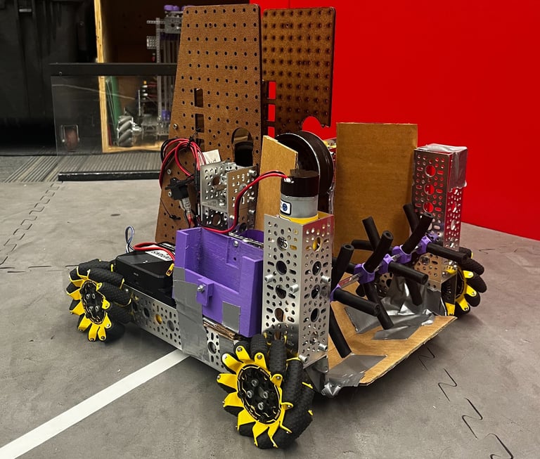 Here's our current robot. It was made for a robot in 30 hours. Made of the "highest quality" components, this robot is able to pick up and shoot artifacts with varying levels of success.